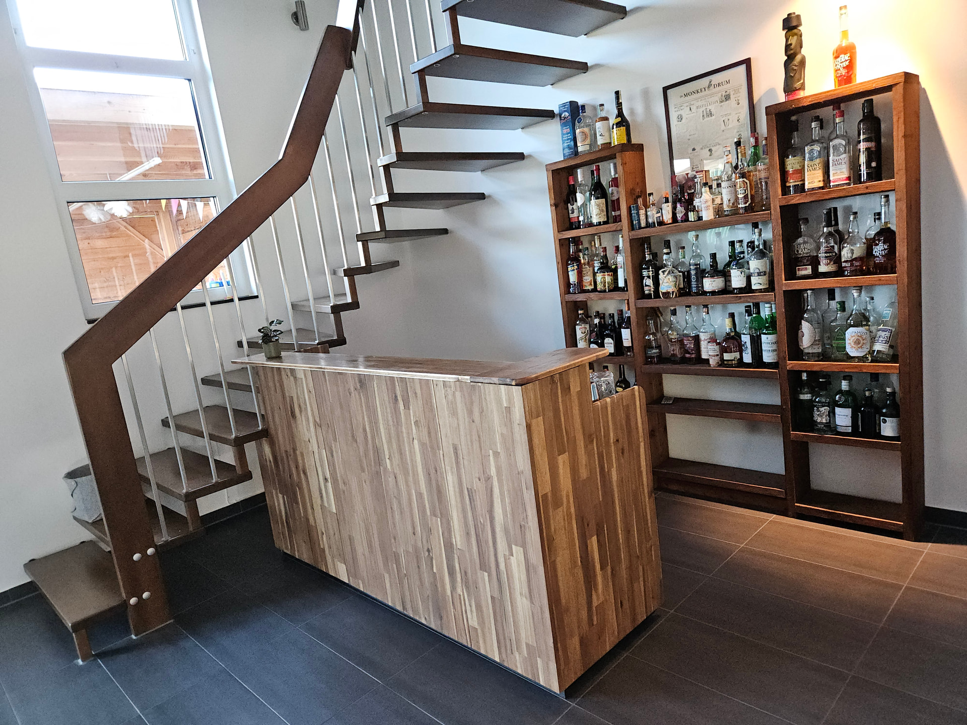 Hier mal zwei schnelle Zeichnungen einer möglichen Bar - ein mal eine kleine Version und eine etwas größer mit großer Spüle, die dann unter der Treppe weiter laufen würde