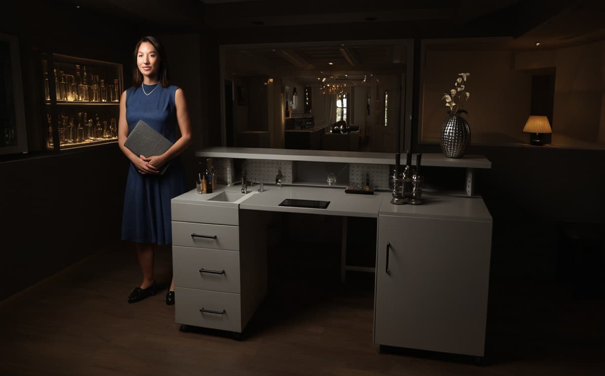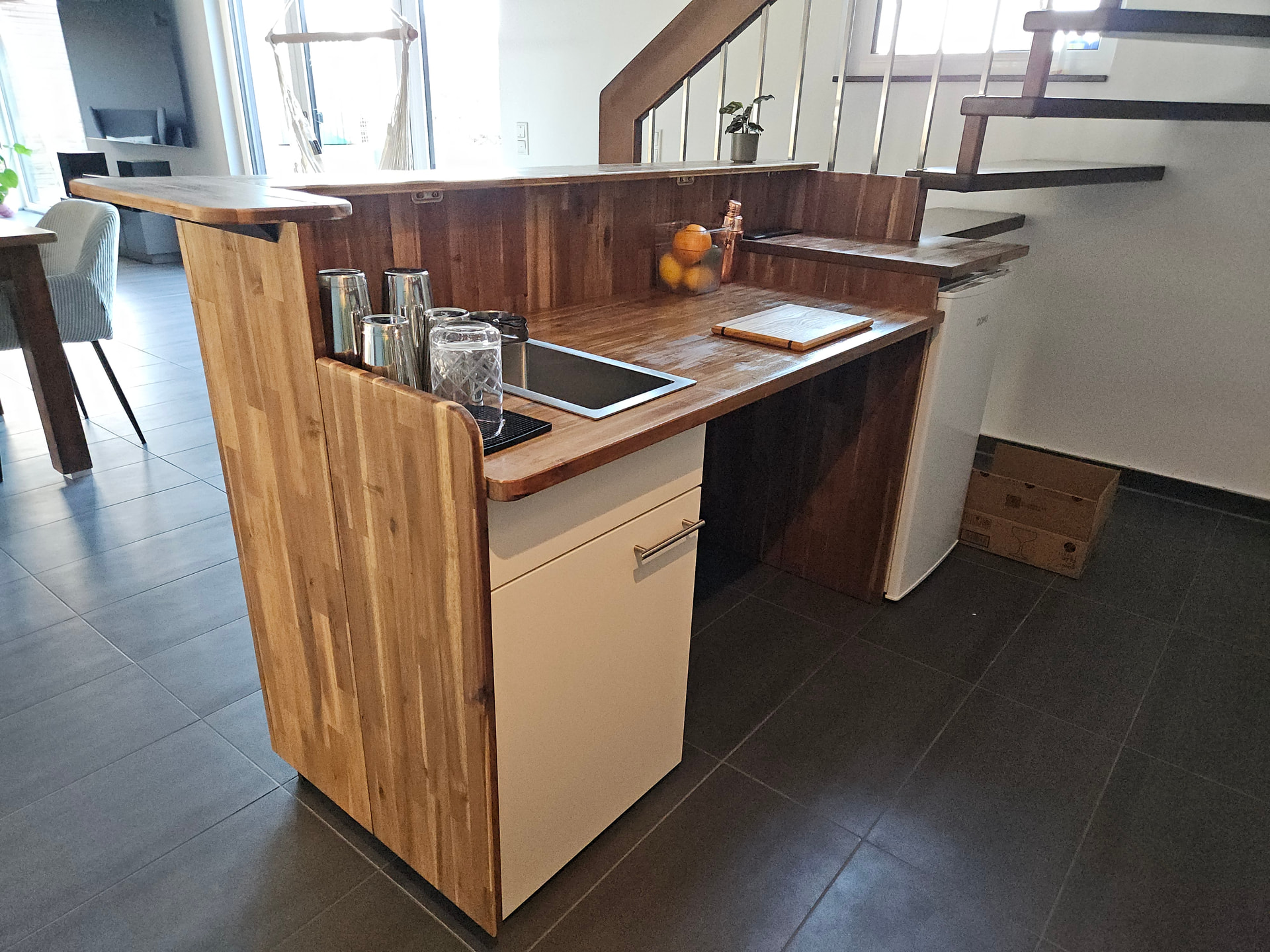 Verbaut werden soll eine (kleine?) Spüle inkl. Gläser dusche ein Mülleimer(loch?) und ein Gefrierschrank für Vorgefrostete Gläser und Eiswürfel.