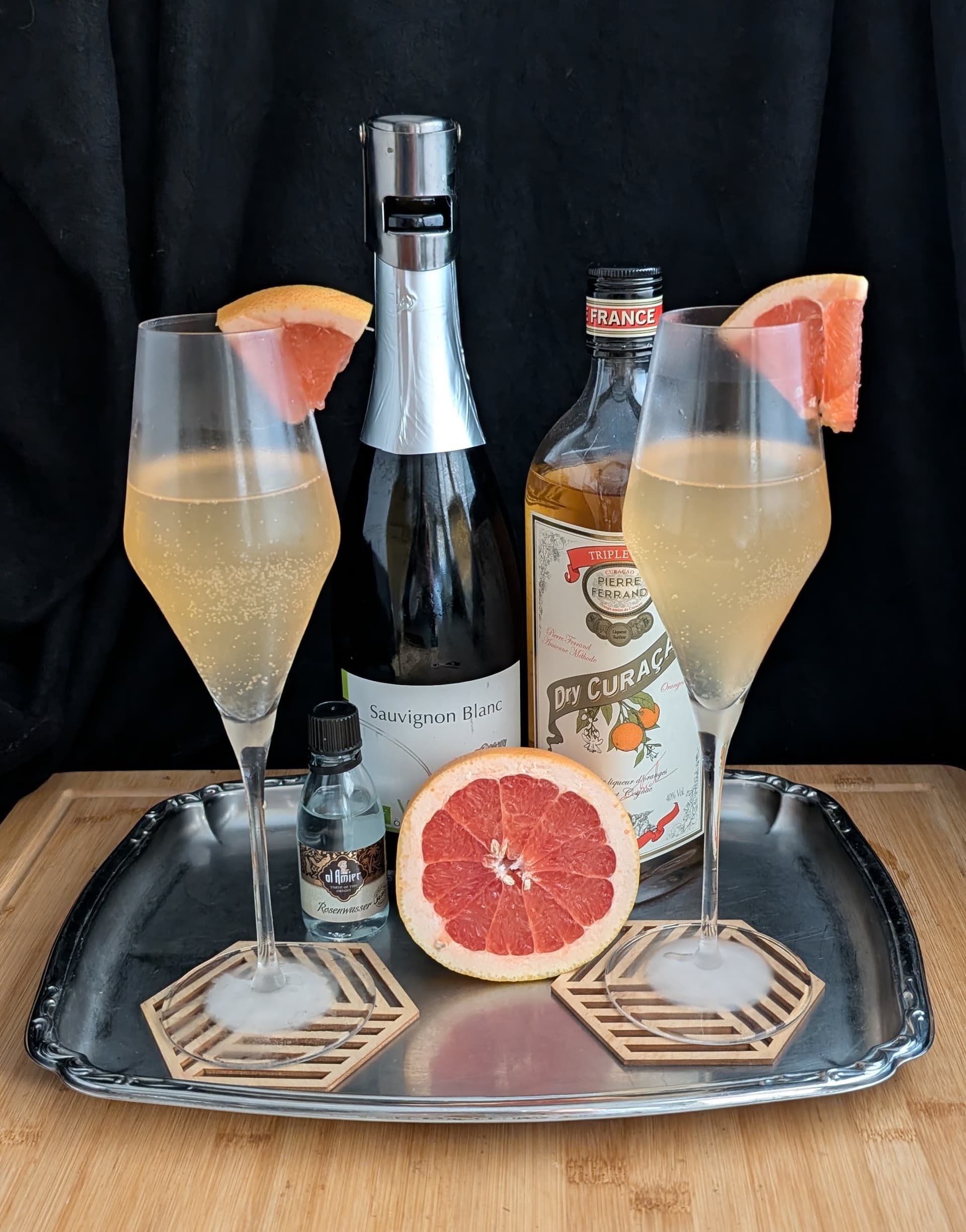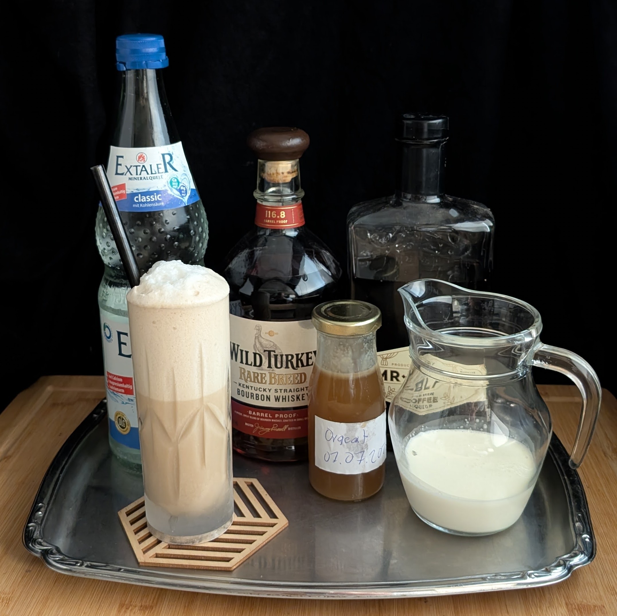 Reverse Dry Shake (alles außer Wasser und Bitters), straight up in ein Highballglas geben, mit Wasser toppen und garnieren.
